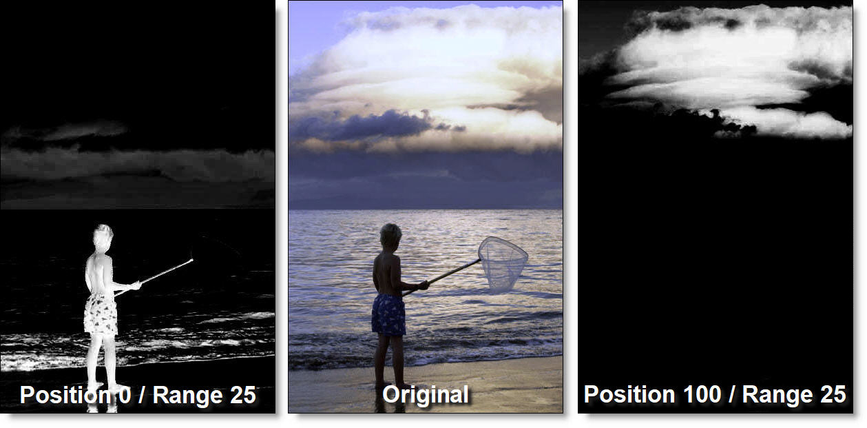 Using the Luminance extraction method, a higher Position value shows more white values from the original image as white values in the mask. A lower Position value shows more black values from the original image as white values in the mask.