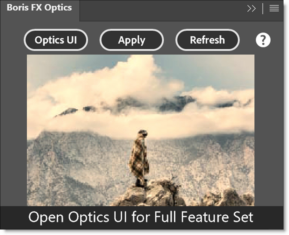 To open the panel, select Plugins > Plugins Panel and click Boris FX Optics.