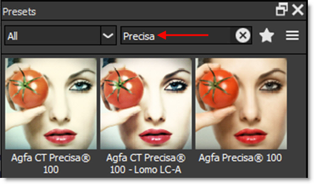 Presets can be searched for by entering text in the search field located at the top of the Presets window. The pattern remains in effect when you switch filters, but it will clear automatically when you switch layers in the Layers window or apply a preset. Clear the search text to return the Presets window to it’s normal state.